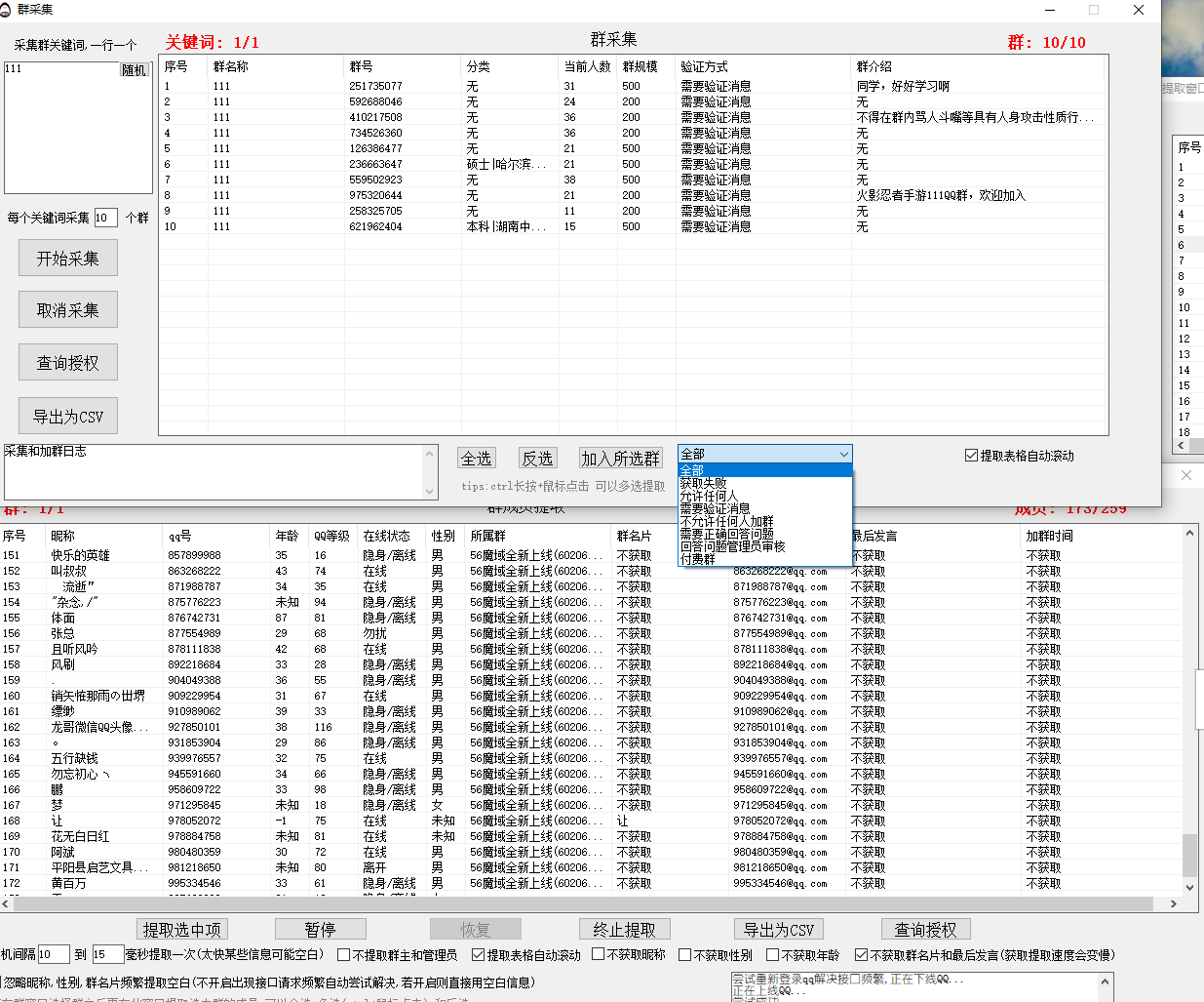 采集,提取,群私聊临时对话,筛选免验证加群全部可以